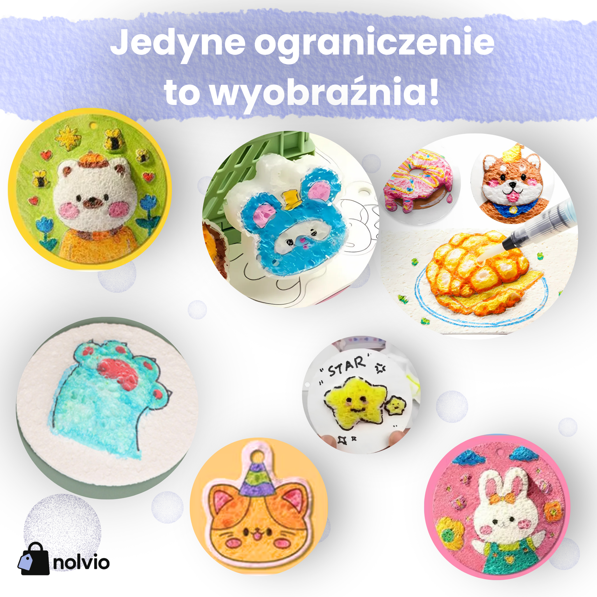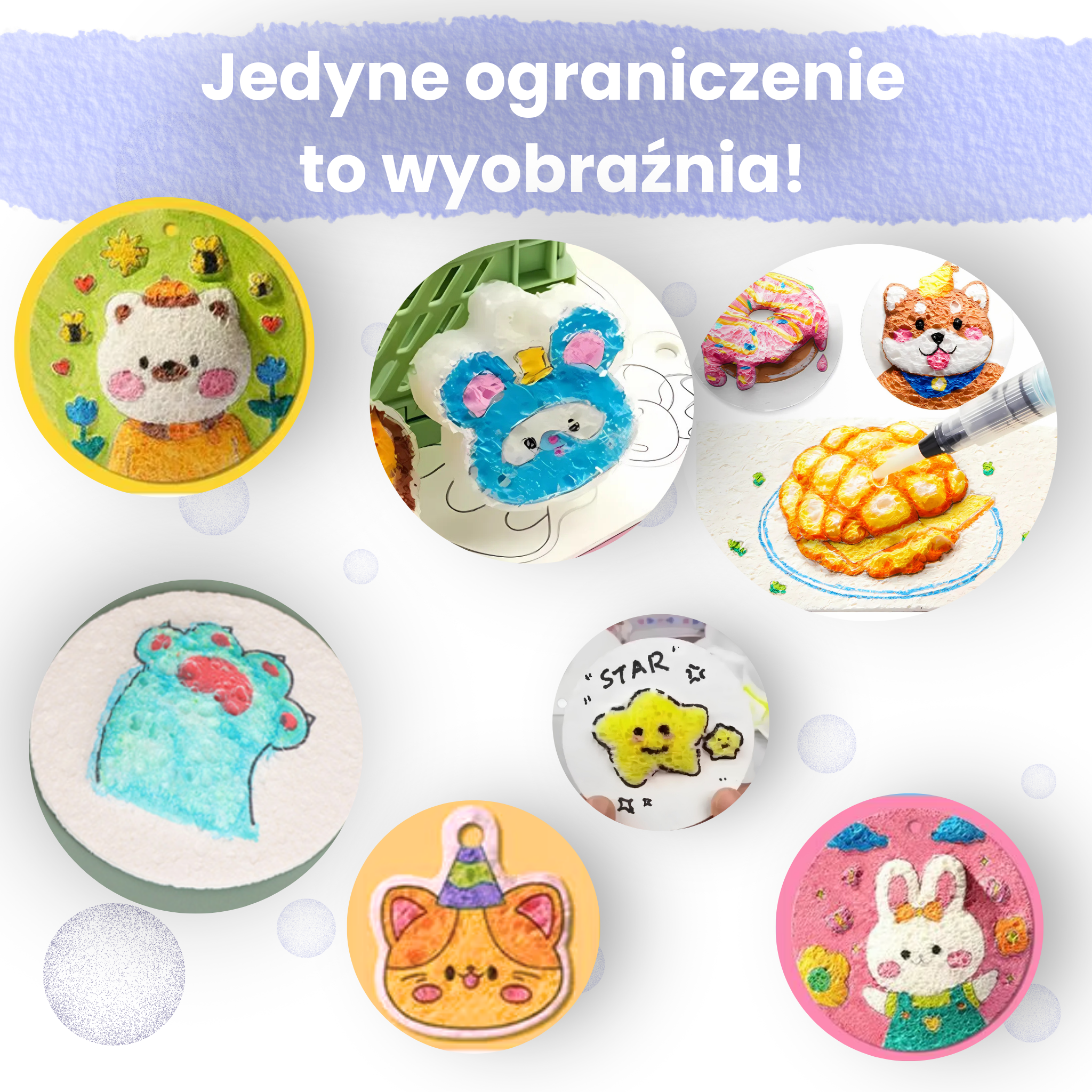 Dziecko koloruje obrazek na specjalnej piance, a potem zwilża go wodą za pomocą pipetki dołączone do zestawu (można też wodnym pędzelkiem). Pod wpływem wody pianka „rośnie” i robi się puszysta, tworząc efekt 3D widoczny od razu. Efekt jest tymczasowy – gdy woda odparuje, pianka stopniowo wraca do płaskiej formy. To idealna zabawa „tu i teraz”, która nie kończy się tylko na jednym rysunku.