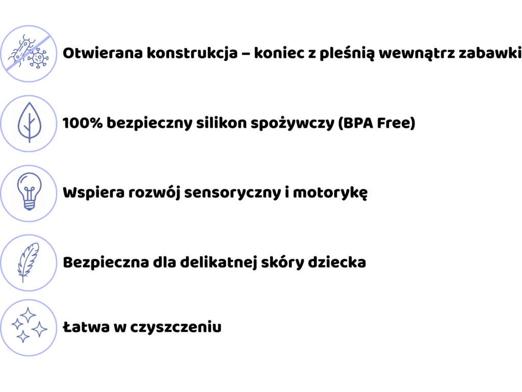 Zamknięte gumowe zabawki to idealne środowisko dla rozwoju czarnej pleśni i bakterii, których nie da się usunąć. Nie ryzykuj zdrowia malucha – to, czego nie widzisz, może być dla niego najbardziej szkodliwe.