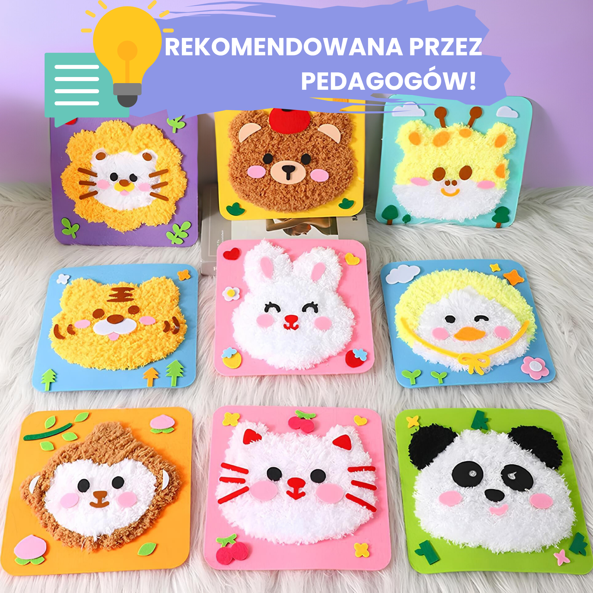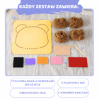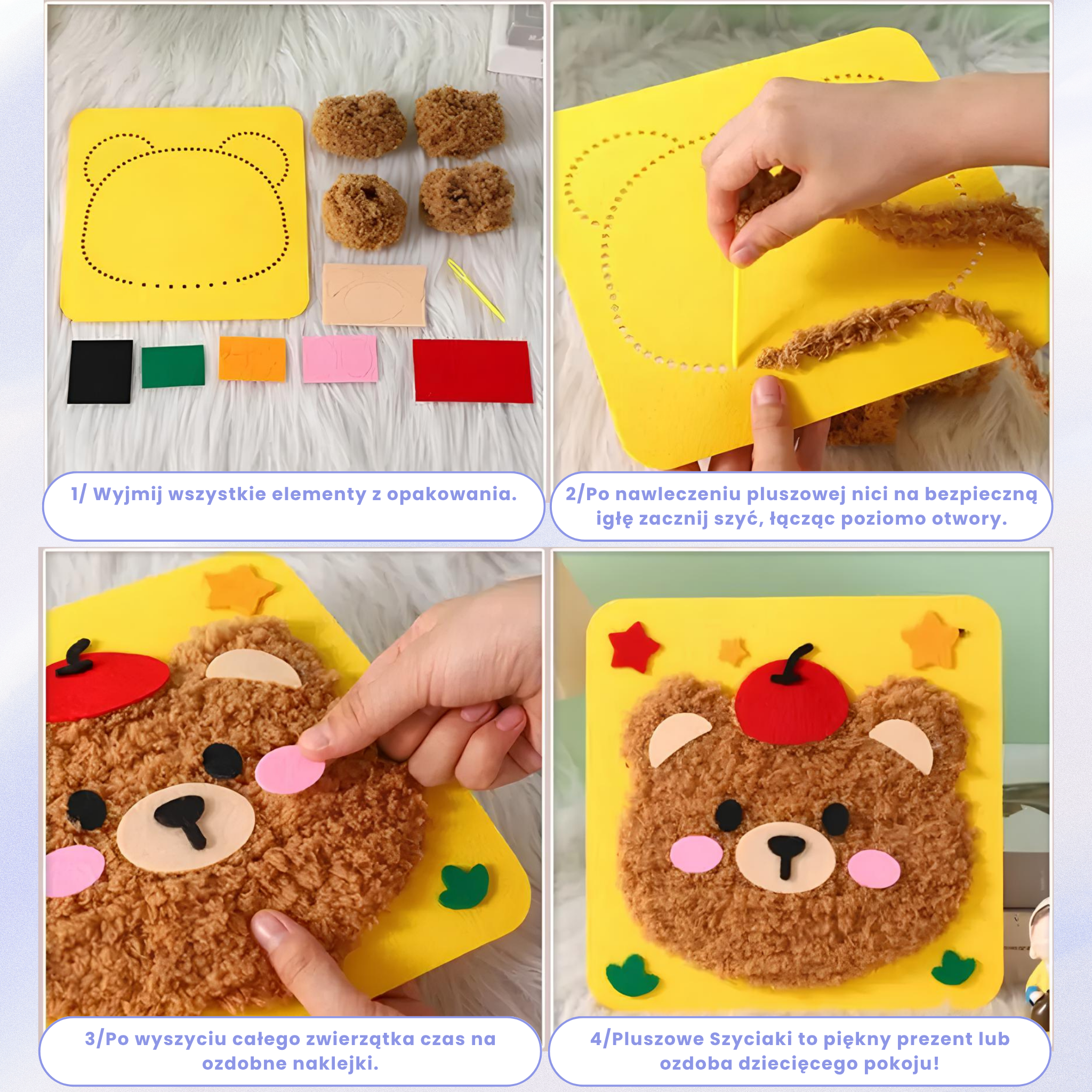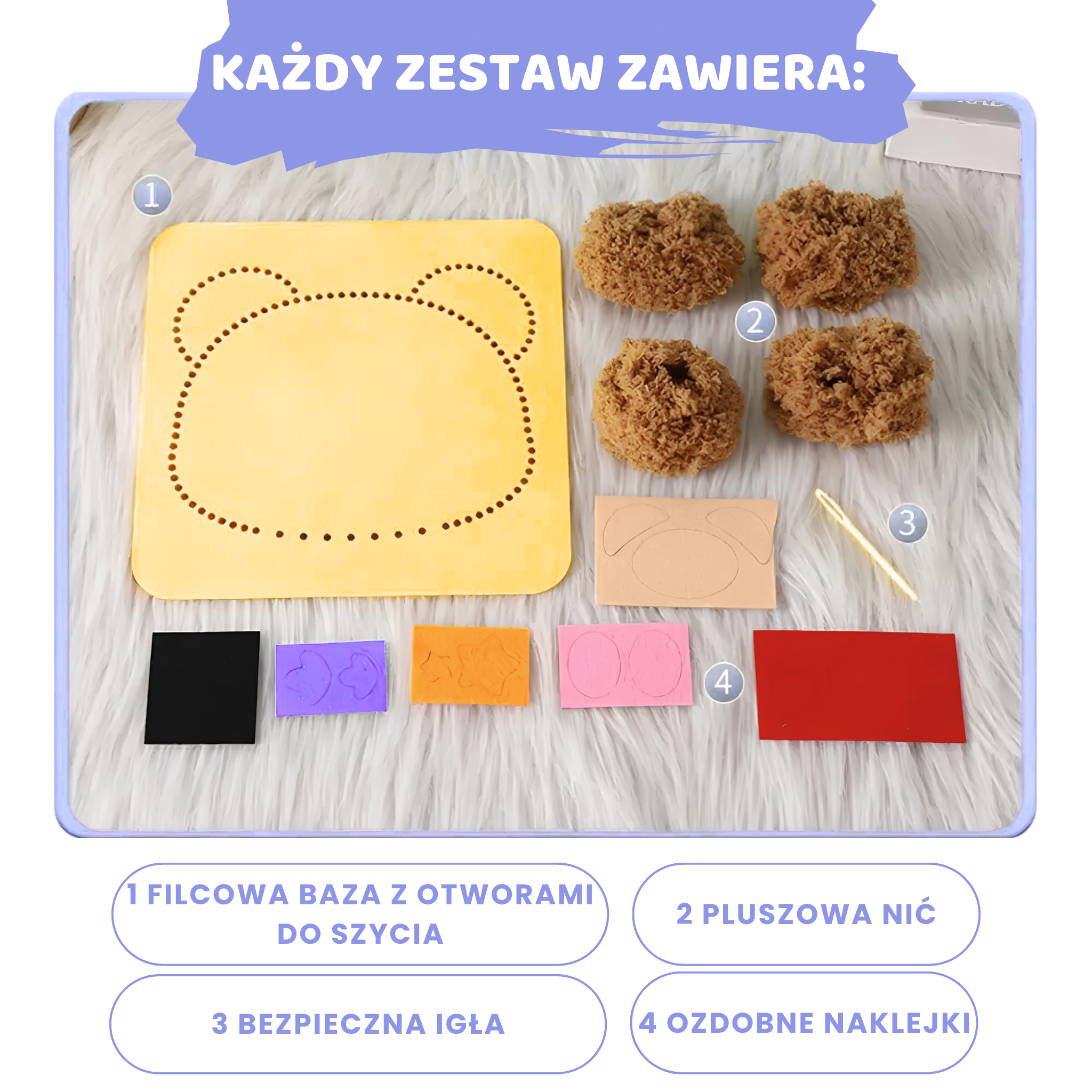 W skład zestawu wchodzą: filcowa baza z dziurkami, bezpieczna igła z tworzywa, puszysta włóczka do wyszywania pluszowych kształtów, ozdobne naklejki.